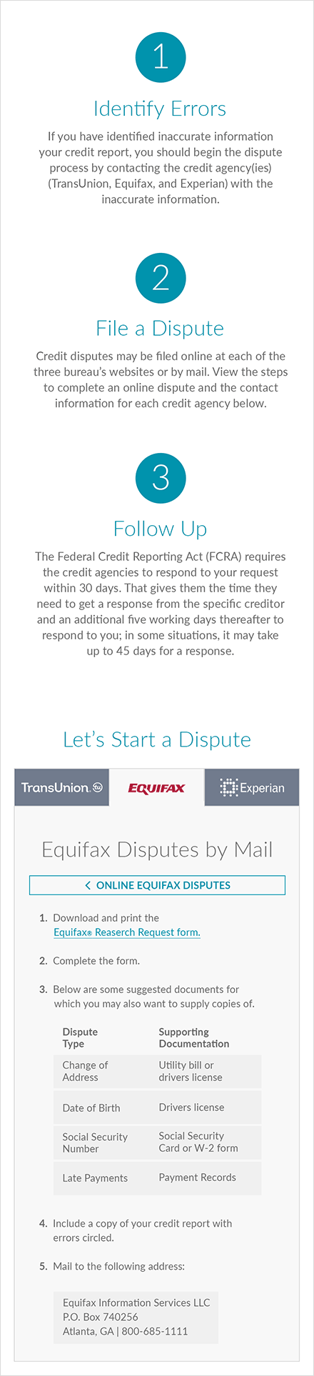 Follow this four-step process to dispute an item on your credit report. Please note that if you suspect the error is a result of fraud, review our Identity Theft Recovery Guide for further information.